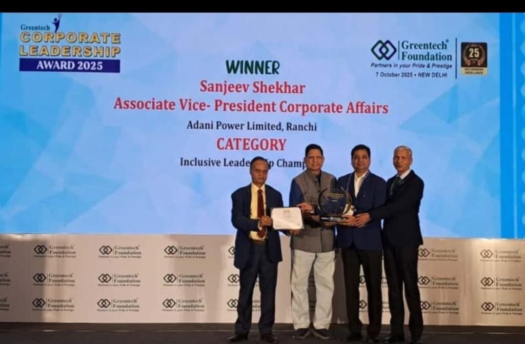 अदाणी पावर झारखंड के हेड कॉर्पोरेट अफेयर्स श्री संजीव शेखर, जो रांची में पदस्थ हैं, को ग्रीनटेक कॉर्पोरेट लीडरशिप अवॉर्ड्स 2025 के तहत आयोजित समारोह में इनक्लूसिव लीडरशिप चैंपियन अवॉर्ड से सम्मानित किया गया। यह सम्मान नई दिल्ली में आयोजित दो दिवसीय समारोह के दौरान प्रदान किया गया।