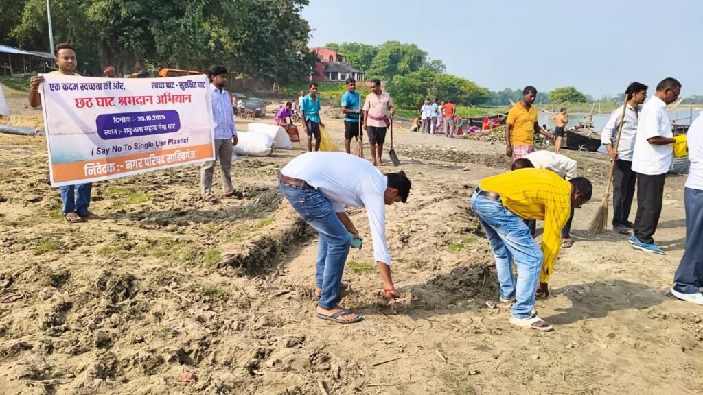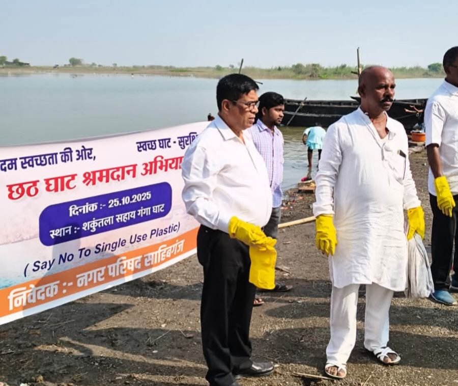 छठ महापर्व के अवसर पर जिला प्रशासन की पहल पर आज ‘‘छठ घाट श्रमदान अभियान’’ के तहत साहिबगंज स्थित शकुन्तला सहाय घाट में सुबह 08 बजे से स्वच्छता अभियान चलाया गया। आगामी छठ पूजा को ध्यान में रखते हुए घाटों को स्वच्छ, सुरक्षित और व्यवस्थित बनाने के उद्देश्य से यह सामूहिक श्रमदान किया गया।