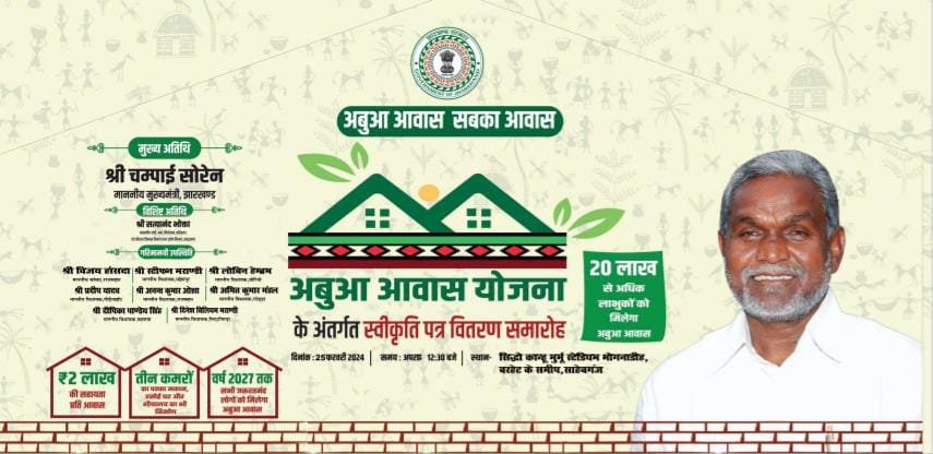 मुख्यमंत्री दोपहर 01 बजे का स्वीकृति पत्र वितरण कार्यक्रम में हिस्सा लेंगे जबकि 3.40 बजे भोगनाडीह बरहेट स्थित अस्थायी हेलीपैड से प्रस्थान करेंगे। आपको बता दें कि प्रथम चरण में 24532 जिसमें साहिबगंज-7911, पाकुड़-6649, गोड्डा-9972 परिवारों को अबुआ आवास के अंतर्गत प्रथम किस्त के रूप में 73,59,60,000 रुपए की राशि स्थानांतरित की जा रही है।