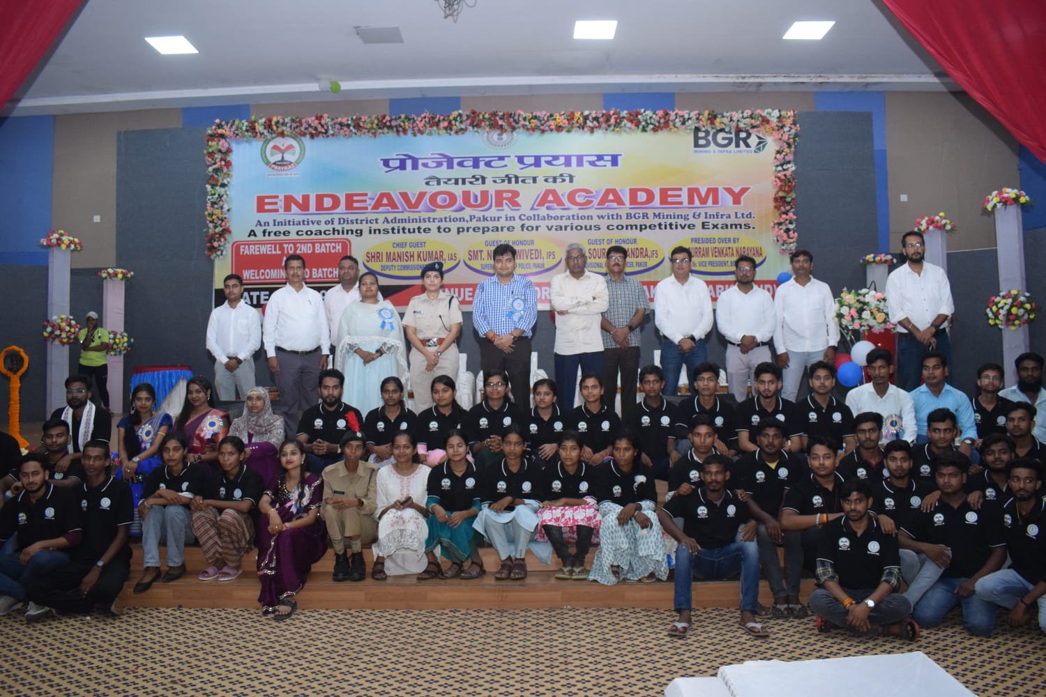 जिला प्रशासन पाकुड़ एवं बीजीआर माइनिंग एंड इंफ्रा लिमिटेड के संयुक्त प्रयास से बुधवार को रविन्द्र भवन टाउन हॉल में प्रोजेक्ट प्रयास – “तैयारी जीत की” के तहत एंडवेर अकादमी के तृतीय बैच (सत्र 2025-26) का शुभारंभ तथा द्वितीय बैच (सत्र 2024-25) के छात्रों का विदाई समारोह बड़े ही उत्साहपूर्वक आयोजित किया गया।