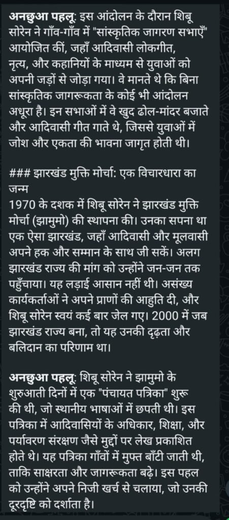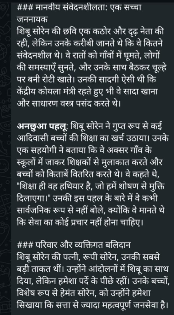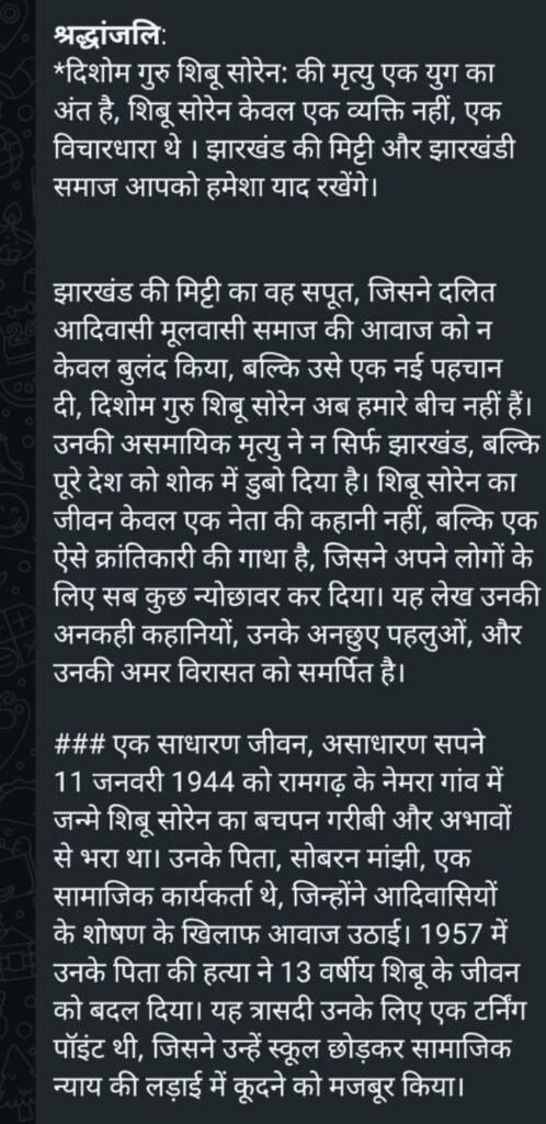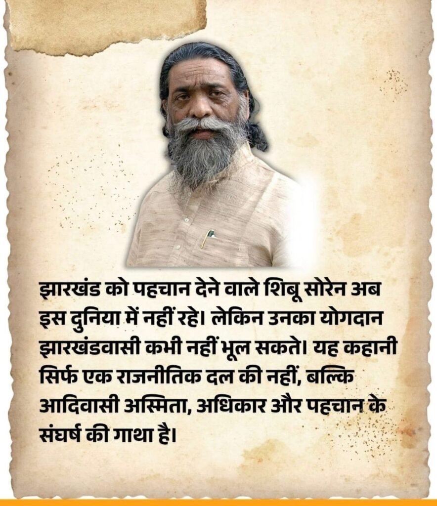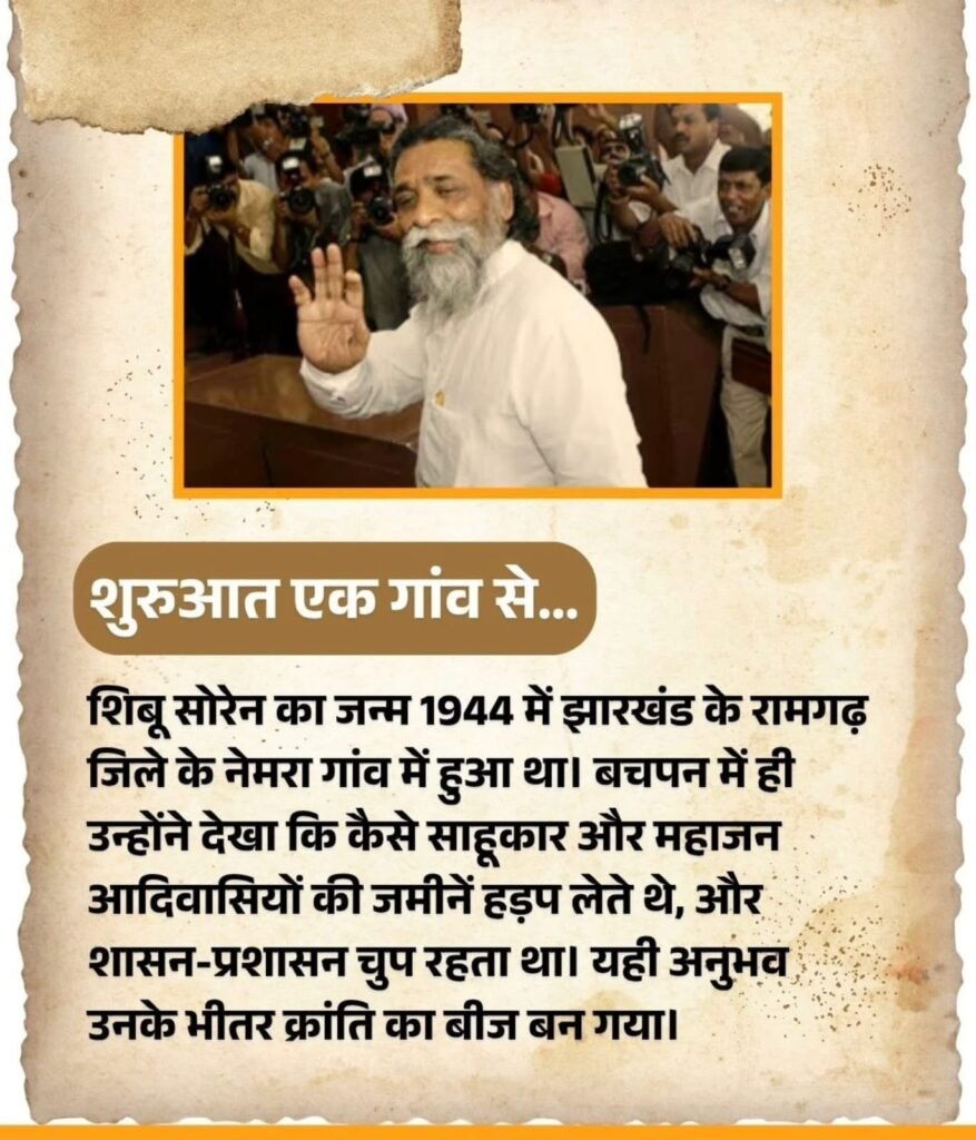 रांची: झारखंड के पूर्व मुख्यमंत्री और झारखंड मुक्ति मोर्चा (JMM) के संस्थापक दिशोम गुरु शिबू सोरेन का आज 81 वर्ष की आयु में निधन हो गया। वे पिछले करीब एक महीने से दिल्ली के सर गंगाराम अस्पताल में इलाजरत थे मुख्यमंत्री हेमंत सोरेन ने सोशल मीडिया प्लेटफॉर्म ‘एक्स’ पर ट्वीट कर इसकी जानकारी दी। उन्होंने लिखा, “आदरणीय दिशोम गुरुजी हम सभी को छोड़कर चले गए हैं। आज मैं शून्य हो गया हूँ।” उनके निधन की खबर से पूरे झारखंड में शोक की लहर दौड़ गई है। शिबू सोरेन झारखंड की राजनीति के एक प्रमुख स्तंभ थे और उनका जाना राज्य के लिए एक बड़ी क्षति है। झारखंड की मिट्टी आज शोक में डूबी है। एक ऐसा सपूत चला गया, जो कभी सत्ता के सामने झुका नहीं। पूर्व मुख्यमंत्री और झारखंड आंदोलन के अग्रदूत शिबू सोरेन का आज गंगाराम अस्पताल में निधन हो गया। 81 वर्षीय गुरूजी लंबे समय से अस्वस्थ चल रहे थे। वे तीन बार झारखंड के मुख्यमंत्री बने और झारखंड राज्य के गठन में उनका योगदान ऐतिहासिक रहा। आख़िर कैसे उन्होंने झारखंड की आवाज़ को राष्ट्रीय मंच तक पहुंचाया और खड़ी की एक मज़बूत राजनीतिक पार्टी — जानिए उनकी पूरी कहानी। धरतीपुत्र, जिन्होंने धनकटी आंदोलन से आदिवासियों, दलितों और गरीबों को हक की जमीन दिलाने की लड़ाई शुरू की। जिन्होंने पिता को खोने के बावजूद समाज की लड़ाई को नहीं छोड़ा, बल्कि जल, जंगल और ज़मीन की पुकार को संसद के गलियारों तक पहुँचाया।