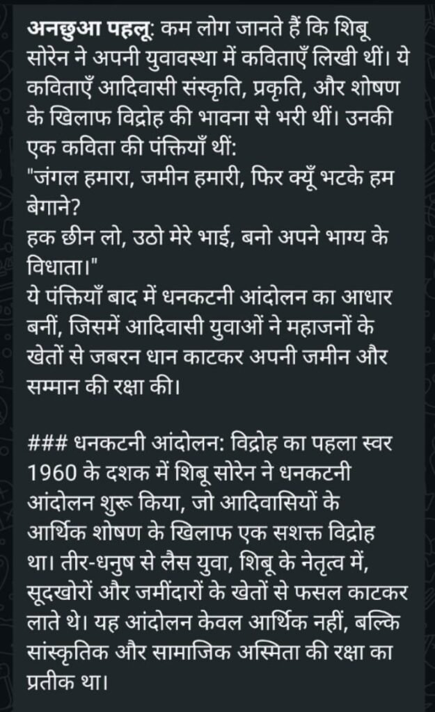 बहुजन चेतना की मशाल और झारखंडी अस्मिता की आवाज़ को हूल जोहार। प्रकृति उन्हें अपने आँचल में वही जगह दे, जो उन्होंने धरती के हर शोषित जन के दिल में पाई है।