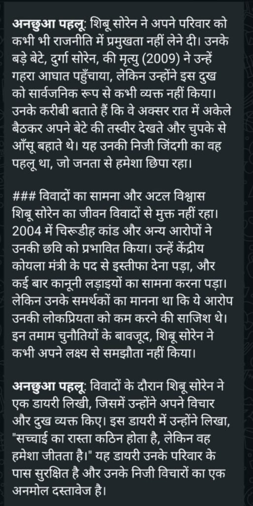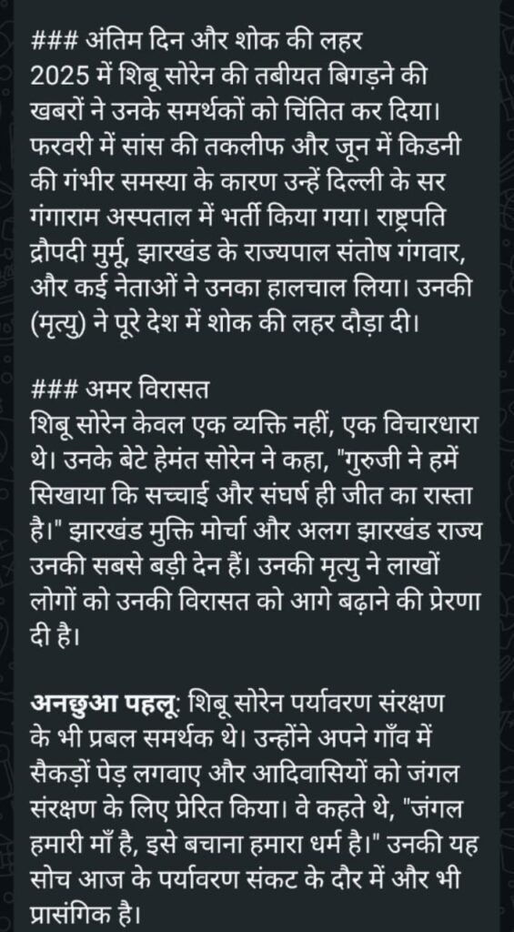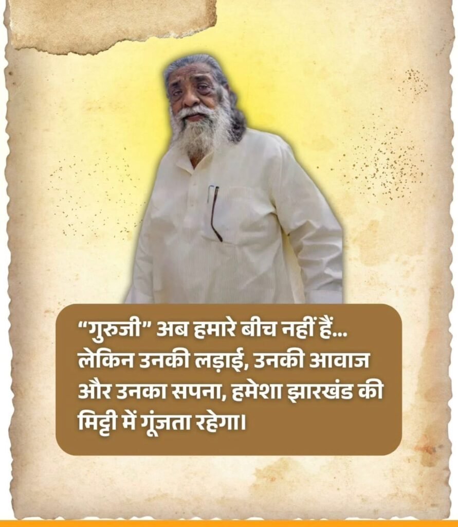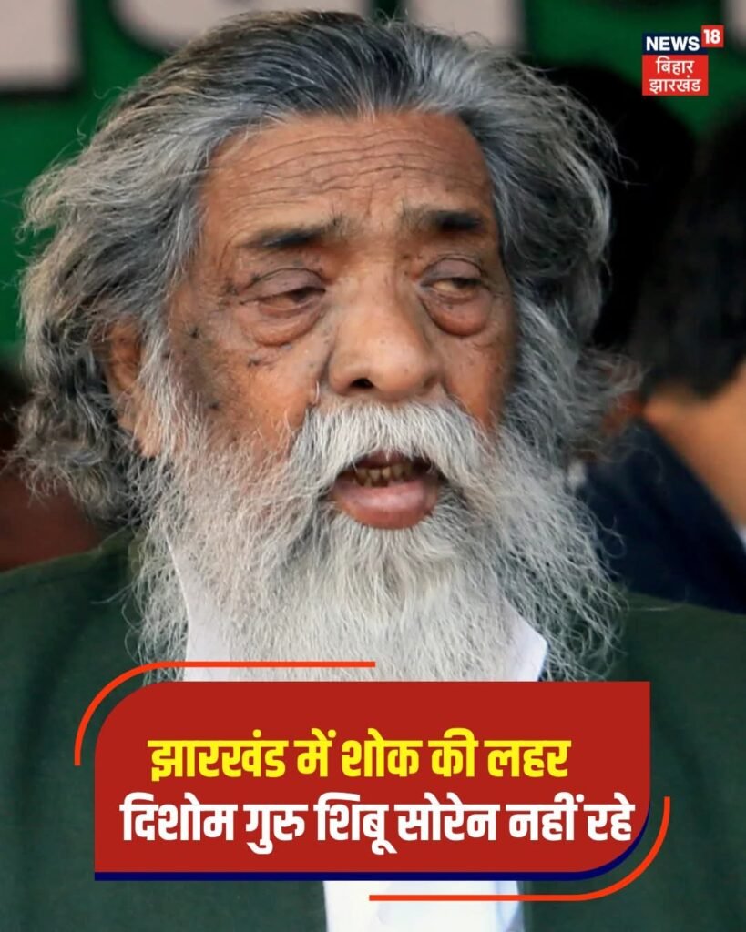 लंबे समय से बीमार चल रहे थे झामुमो के संस्थापक और पूर्व मुख्यमंत्री झारखंड मुक्ति मोर्चा (JMM) के संस्थापक, पूर्व मुख्यमंत्री और राज्यसभा सांसद दिशोम गुरु शिबू सोरेन का निधन हो गया। वह 81 वर्ष के थे और दिल्ली के सर गंगाराम अस्पताल में इलाजरत थे। मुख्यमंत्री हेमंत सोरेन ने सोशल मीडिया पर दुख व्यक्त करते हुए कहा, “आज मैं शून्य हो गया हूँ”। उनके निधन से पूरे झारखंड में शोक की लहर है।