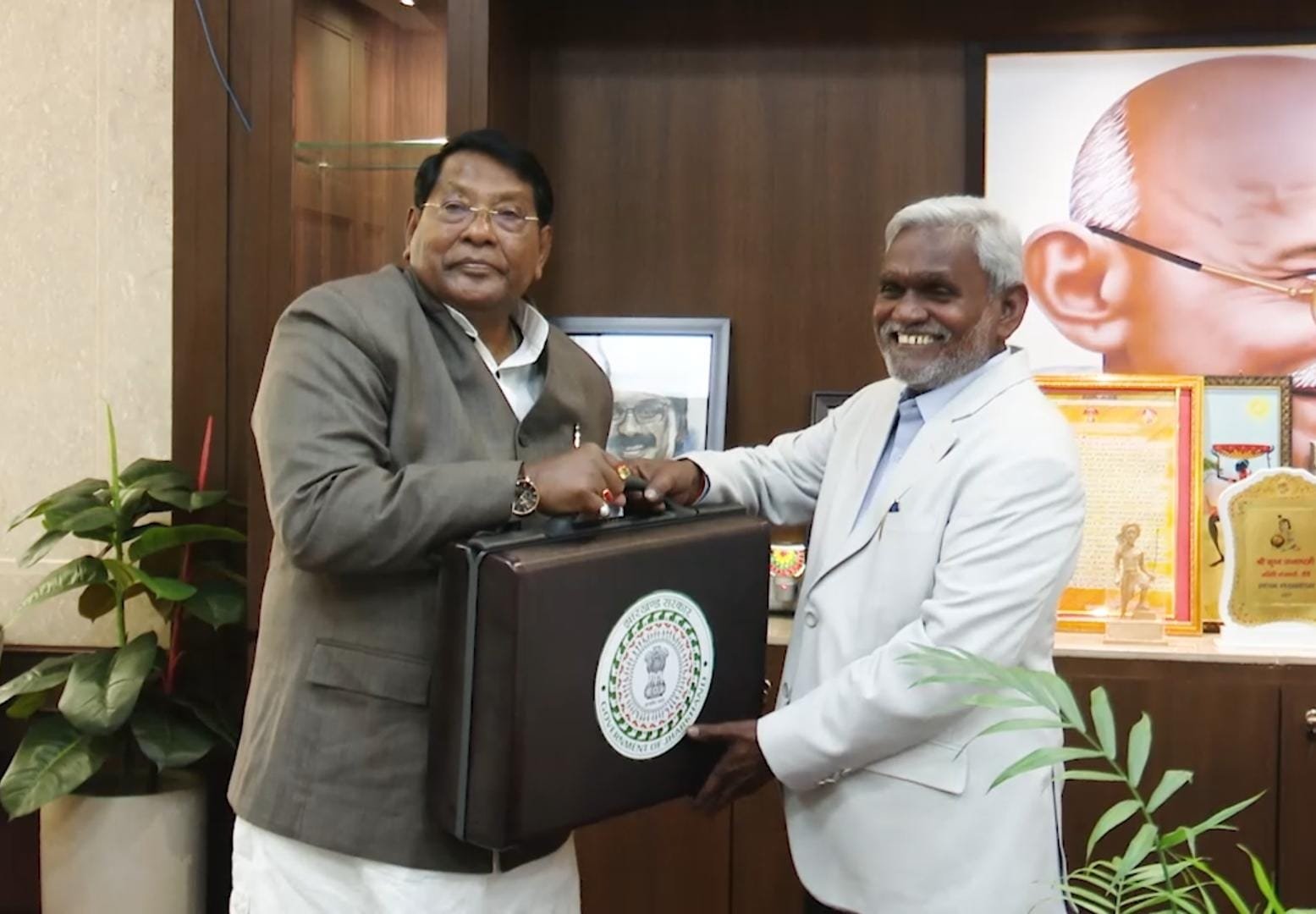 बजट पेश करने से पूर्व झारखंड विधान सभा स्थित मुख्यमंत्री कक्ष में मुख्यमंत्री श्री चम्पाई सोरेन को बजट की प्रति भेंट करते हुए वित्त मंत्री श्री रामेश्वर उरांव।