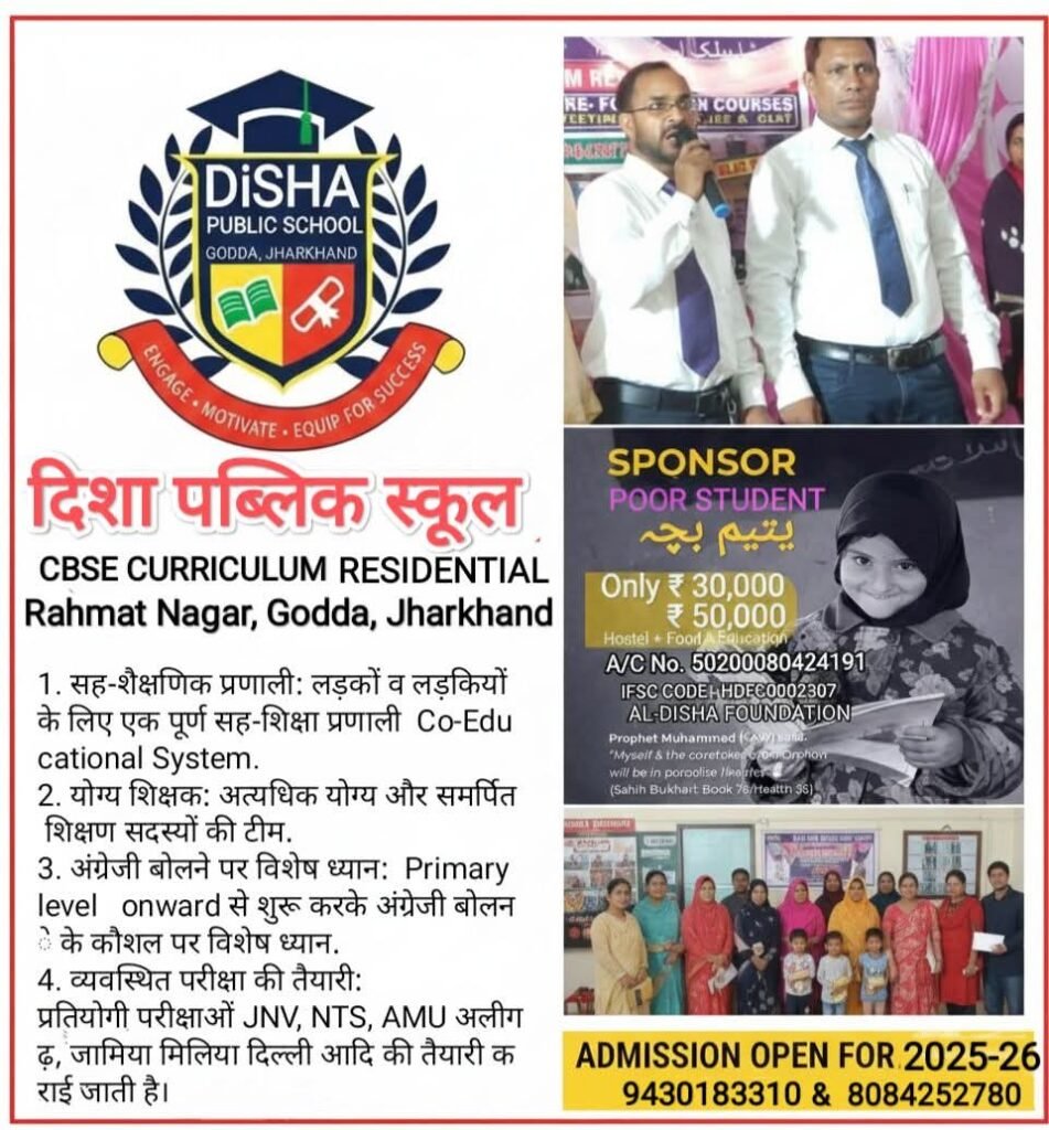 अल-दिशा फाउंडेशन द्वारा संचालित दिशा पब्लिक स्कूल, गोड्डा ने एक बार फिर राष्ट्रीय स्तर पर अपनी प्रतिभा का लोहा मनवाया है। शिक्षा और खेल के क्षेत्र में ‘बेहतर एजुकेशन सिस्टम और दूरदर्शी सोच’ के साथ आगे बढ़ रहे इस संस्थान के छात्र मो. अयान रज़ा ने दिल्ली में आयोजित सब-जूनियर नेशनल चैंपियनशिप में शानदार प्रदर्शन करते हुए सिल्वर मेडल प्राप्त किया है।