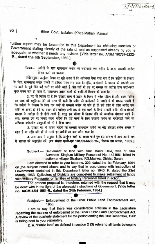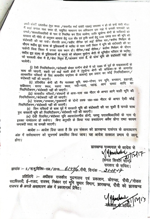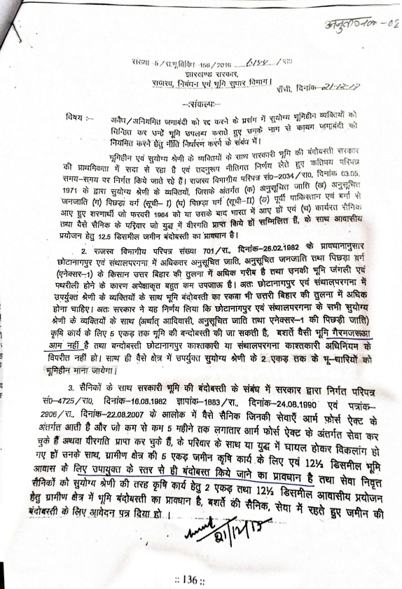 मालूम हो कि जब कभी भी सैनिक को जीमन बंदोबस्त करने का अधिकार जिले के उपायुक्त को होता है, किन्तु नियम को ताक पर रख कर ग्राम प्रधान द्वारा ही इस गैरमजरूआ जमीन जो कि जंगल के रूप में उल्लेखित है, सैनिक लाल बिहारी सिंह के नाम बन्दोबस्त कर दिया गया है। दरअसल, सरकर के पत्रांक- ए0/जीएम0-1/64 1551- आर। दिनांक 24.02.1964 एवं पत्रांक-239 दिनांक 01.02.1964, पत्रांक-1946/रा0, दिनांक 23.03.1963 में उल्लेख है कि सैनिक को जमीन बंदोबस्त के ममले में उपायुक्त ही सक्षम प्राधिकार है । साथ ही राजस्व निबंधन एवं भूमि सुधार विभाग झारखंड सरकर के पत्रांक- 6144 /रा0 ,रांची दिनांक 21.12.2017 के कंडिका-3 उल्लेख है की सैनिकों के साथ सरकारी भूमि की बंदोबस्त के संबंध में सरकार द्वारा निर्गत परिपत्र संख्या-4725 दिनांक 16.08. 19, ज्ञापांक-1883/रा0 दिनांक 24.08.1990 के आलोक में वैसे सैनिक जिसकी सेवाएं आर्म फोर्स एक्ट के अंतर्गत आती है जो कम से कम 5 महीने तक लगातर आर्म फोर्स एक्ट के अंदर सेवा कर चूके हैं अथवा वीरगति प्राप्त कर चूके हैं , के परिवार के साथ या युद्ध में घायल होकर विकलांग हो गए उनके साथ ग्रामीण क्षेत्र की 5 एकड़ जमीन कृषि कार्य के लिए एवं 12.5 डिसमिल भूमि आवास के लिए उपायुक्त के स्तर से बंदोबस्त किए जाने का प्रावधान है बशर्ते कि उक्त भूमि भूमि गैरमजरूआ श्रेणी की ना हो।