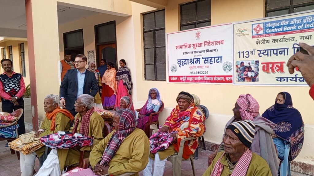 सेन्ट्रल बैंक ऑफ इंडिया गया के क्षेत्रीय प्रबंधक प्रणव कपुर के द्वारा वृद्धाश्रम सहारा गया में दर्जनों लाभुक के वीच कम्बल,साङी,स्वेटर,,फल,मिठाई का वितरण सेंट्रल बैंक ऑफ इंडिया के 113वां स्थापना दिवस के अवसर पर किया गया!मौके पर क्षेत्रीय प्रबंधक प्रणव कपूर ने कहा कि आज हमे खुशी हो रही है कि लाचार व वेवस लोगों को सेवा करने का मौका मिल रहा है उन्होंने कहा कि आज के समय लड़के अपने माता पिता को भीख मांगने पर मजबूर करे है धन्य है ऐसी संस्था जो गरीब लोगों को सेवा कर रही है साथ ही साथ ठंड को देखते हुए हमलोग ने निर्णय लिया कि गरीब लोगों को सेवा करने का मौका मिल रहा है। इस दौरान सेंट्रल बैंक ऑफ इंडिया के मुख्य प्रबंधक विवेक कुमार, प्रबंधक अंकित कुमार , सहायक प्रबंधक विकाश आनंद,सहायक निदेशक (भ्रष्टाचार निरोधक जांच ब्युरो सत्यानंद कुमार, शहर आफिसर गया राजेश मिश्रा,वृद्धाश्रम अधीक्षक मनोज कुमार उपस्थित थे ।