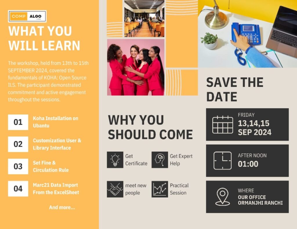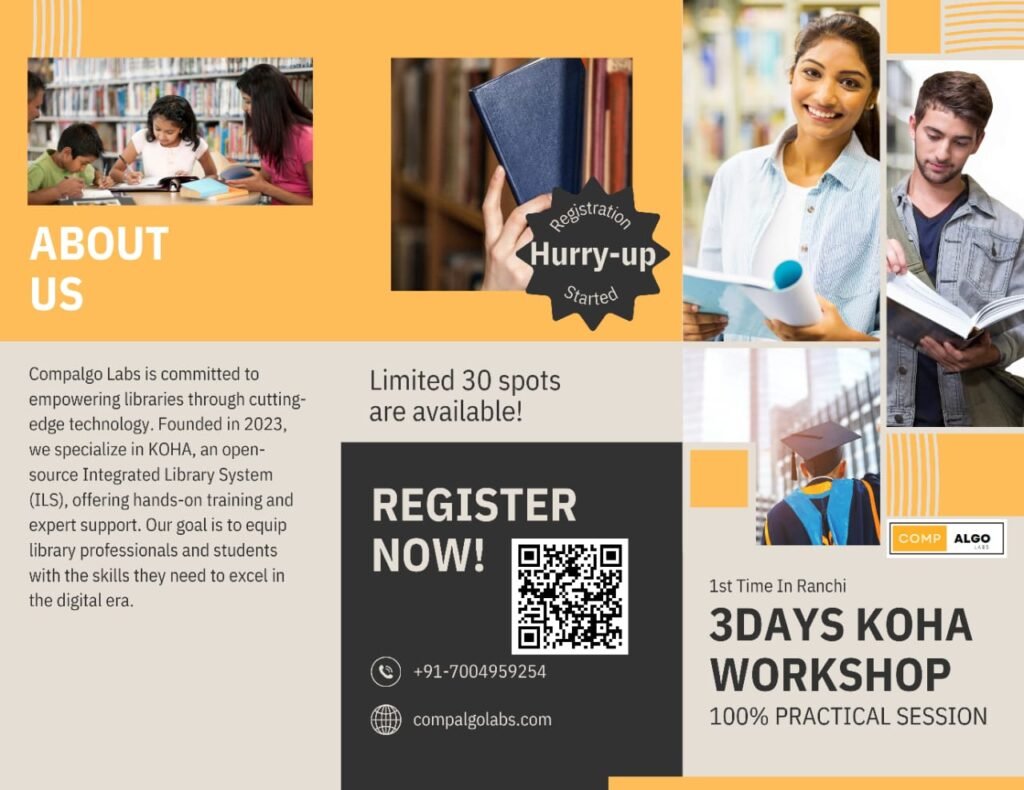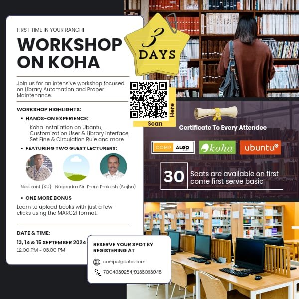 सिर्फ 3 दिन बचे हैं! यह आपके लिए एक शानदार अवसर है अपनी लाइब्रेरी प्रबंधन कौशल को बेहतर बनाने का। Compalgo Labs द्वारा आयोजित 3-दिवसीय KOHA वर्कशॉप, जो रांची में 13 से 15 सितंबर 2024 के बीच हो रही है, आपको KOHA Integrated Library System (ILS) के साथ लाइब्रेरी ऑटोमेशन के हर पहलू पर प्रशिक्षण देगी।
