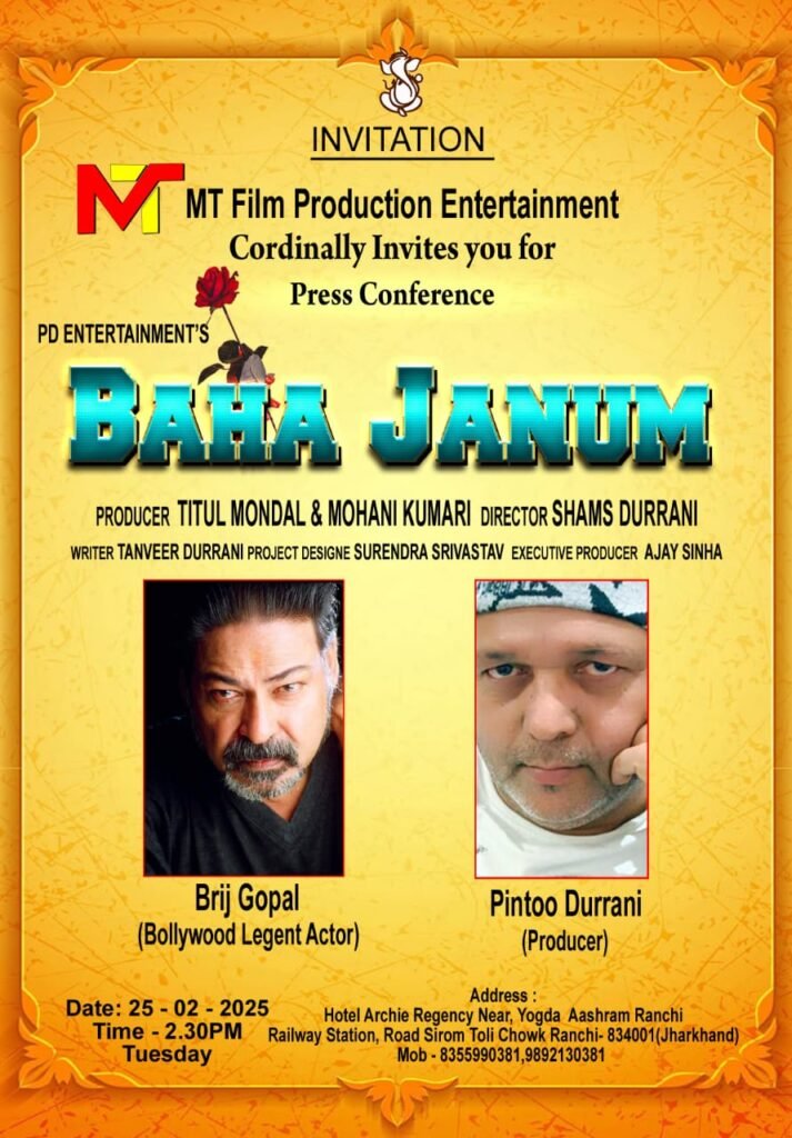 आज का यह प्रेस कॉन्फ्रेंस पीडी एंटरटेनमेंट और एमटी फिल्म प्रोडक्शन के बैनर तले बन रहे क्षेत्रीय भाषा (संथाली) पर आधारित फिल्म बहा जनम जिसका हिंदी (फूल काटे) की बातों को लेकर आप लोगों के समक्ष साझा करने को लेकर प्रेस कॉन्फ्रेंस रखी गई हैं।