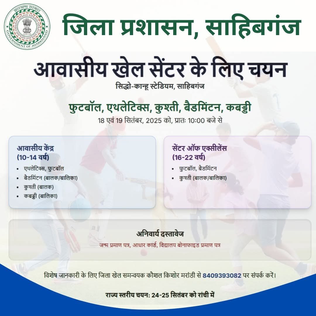 खेलकूद एवं युवा कार्य निदेशालय, झारखंड, रांची के निर्देशानुसार जिले में संचालित आवासीय क्रीड़ा प्रशिक्षण केंद्रों, सेंटर ऑफ एक्सीलेंस प्रशिक्षण केंद्रों एवं जेएसएसपीएस खेल प्रशिक्षण केंद्रों में रिक्त स्थानों की पूर्ति हेतु खिलाड़ियों का चयन किया जाएगा। इसके लिए 18 और 19 सितंबर को सिद्धो-कान्हू स्टेडियम, साहिबगंज में सुबह 10:00 बजे से खेल प्रतिभा खोज चयन प्रतियोगिता का आयोजन जिला खेल कार्यालय साहिबगंज की ओर से किया जाएगा।