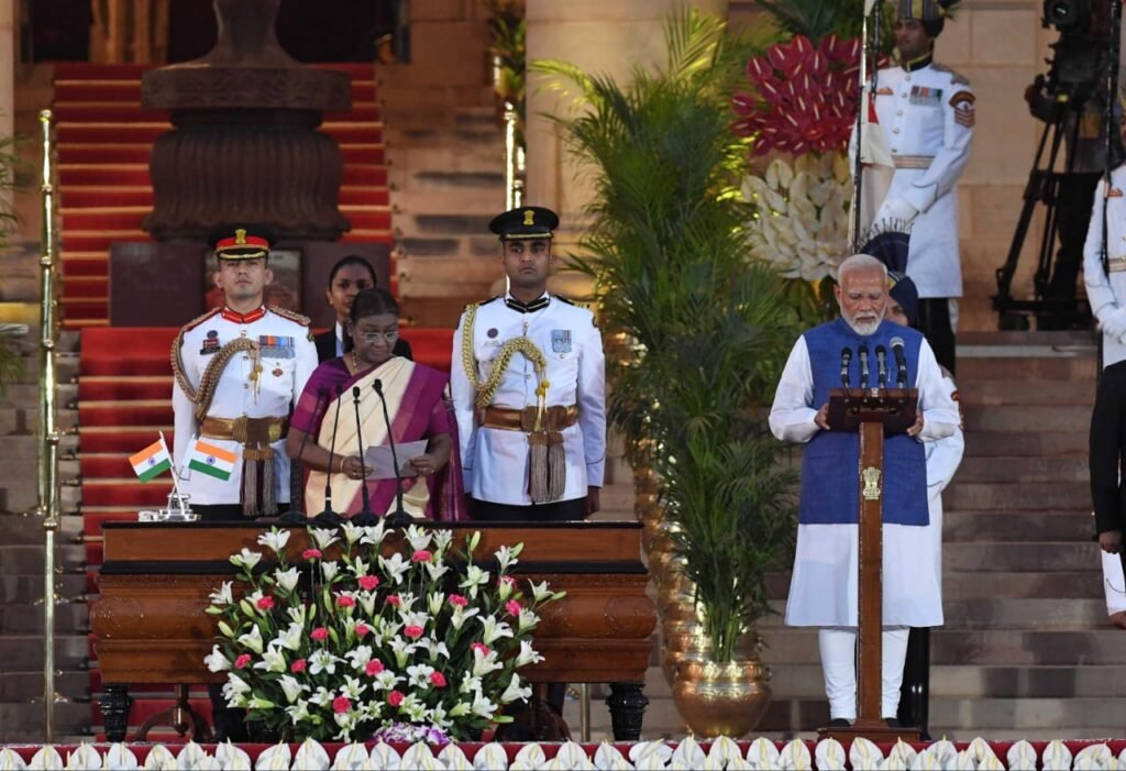 राष्ट्रपति द्रौपदी मुर्मु ने राष्ट्रपति भवन में आयोजित शपथ ग्रहण समारोह में प्रधान मंत्री श्री नरेंद्र मोदी को पद और गोपनीयता की शपथ दिलाई।
