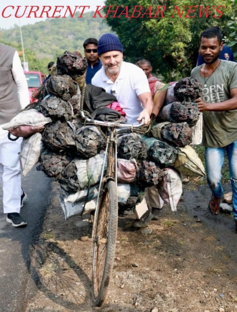 रामगढ़ :राहुल गाँधी ने रामगढ़ में कोयला लाद कर ले जा रहे लोगों से बात की और कोयला लदी साइकिल को भी थोड़ी दूर खींचा
